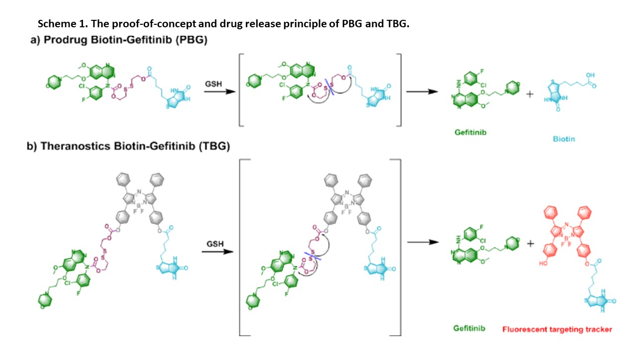 coupling a near-infrared azo-BODIPY fluorophore into the molecular structure of PBG, we obtain its fluorescent theranostic TBG. The prodrug PBG can sustain Gefitinib release by the