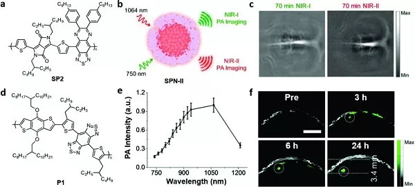 a)SP2的化学结构; b)通过纳米沉淀技术制备的具有NIR-1和NIR-II PA成像能力的SP2纳米颗粒(SPN-II);c)静脉内注射SPN-II后70分钟,在750 nm(左)和1064 nm(右)进行大鼠皮质的体内PA成像;d)P1的化学结构;e)制备的P1纳米颗粒在不同波长下的PA强度;f)在施用P1纳米颗粒后的不同时间点的原位脑肿瘤的体内NIR-II PA成像。通过灰色超声图像指示颅骨边缘,而PA图像中的绿色信号显示纳米颗粒分布,表明距离颅骨3.4 mm处存在脑肿瘤。