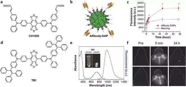 a)小分子NIR-II染料CH1000的化学结构;b)EGFR affibody固定的CH1000纳米颗粒即Affibody-DAP的示意图;c)使用affibody-DAP和随时间阻断的甲状腺肿瘤的靶向体内NIR-II荧光成像的信号强度的变化; d)具有聚集诱导发射(AIE)特征的TB1的化学结构; e)TB1点的UV-vis吸光度和荧光光谱; 插图显示在溶液(左)和粉末(右)形成的TB1的荧光图像; f)在不同时间点使用TB1-RGD点(顶部)和TB1点(底部)对原位脑肿瘤进行靶向NIR-II荧光成像。