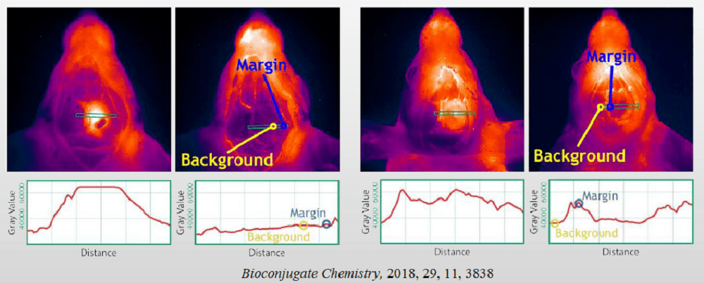 NIR-II成像的高灵敏度可对肿瘤组织进行精准定位。利用靶向NIR-II荧光探针成像并引导进行小鼠头部肿瘤切除手术。实验分两组进行,在完全切除手术后(左二),选区线扫结果显示病灶部位近红外信号明显减弱,与健康组织相似,在对比实验(右二,人为留下少部分肿瘤组织)中则观察到部分区域仍存在高强度信号,肿瘤组织的切除并不完全,表明NIR-II在肿瘤摘除手术中具有潜在的指导作用。