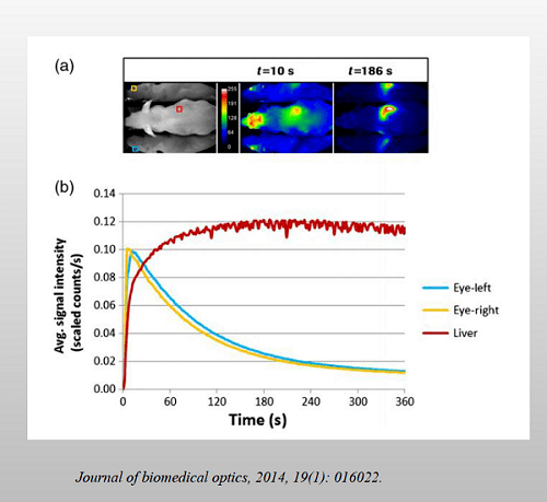 临床前药代动力学(PKs)的常用方法为在不同的时间点抽取血液,并通过不同的分析方法对血液水平进行定量。NIR-II可以通过测量麻醉小鼠眼睛和其他身体区域中标记化合物的荧光强度,无创地连续监测血液水平。通过非侵入性眼睛成像测量的血液水平与通过经典方法产生的结果之间有极好的相关性。全身成像显示预期区域(如肝脏、骨骼)有化合物积聚。所以眼睛和全身荧光成像的结合能够同时测量血液PKs和荧光标记化合物的生物分布。