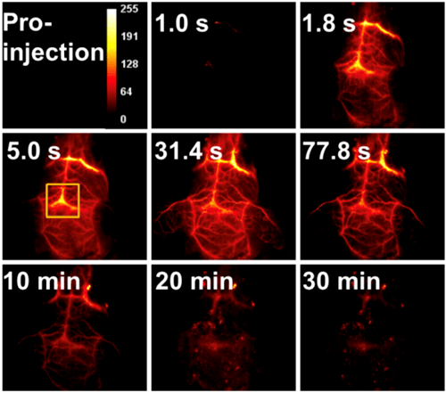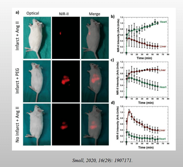 利用近红外荧光成像的优越采集速度和近红外发射纳米粒子的有效选择性靶向,在急性梗塞事件后仅几分钟就获得了梗塞心脏的体内图像。