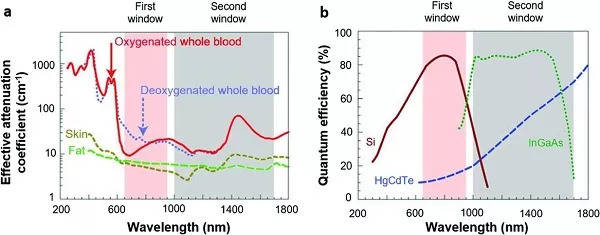 Figure 1. 生物组织和光电探测器在200~1800 nm范围内的光学特性。 a)光学波长在各种生物实体的衰减,例如含氧和脱氧的全血、皮肤和脂肪(NIR-I,700~900 nm,粉红色阴影;NIR-II,1000~1700 nm,灰色阴影);b)不同类型的光电探测器的量子效率。基于硅(Si),铟镓砷(InGaAs)和碲化汞镉(HgCdTe)的光电探测器作为波长的函数。