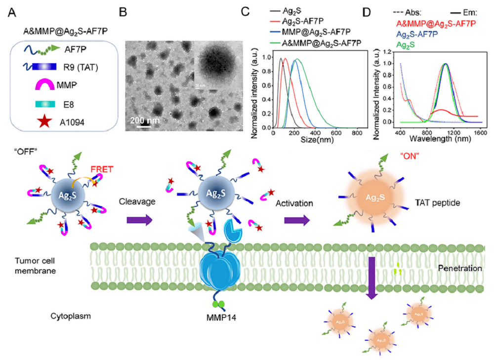 准确的分析病理组织是肿瘤手术成功的关键之一,一种可被基质金属蛋白酶(MMP)14激活的NIR-II纳米探针A&MMP@Ag2S-AF7P,可用于体内外神经母细胞瘤诊断和非破坏性的组织病理学分析。