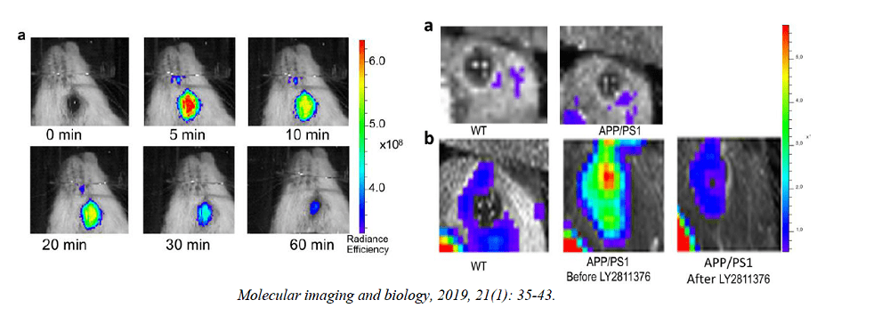 近红外荧光(NIRF)成像已广泛用于临床前研究;然而,它的低组织穿透性对于神经退行性疾病的转化临床成像来说是一个令人生畏的问题。众所周知,视网膜是中枢神经系统(CNS)的延伸,被广泛认为是大脑的窗口。因此,视网膜可以被认为是研究神经退行性疾病的替代器官,并且眼睛由于其高透明性而代表理想的NIRF成像器官。利用CRANAD-X荧光探针标记淀粉样蛋白β(aβ),并利用成像系统对眼部进行观察可以明显观察到患病前后及治疗前后眼部的荧光强度的差异,进而在未来的人类研究中具有显著的转化潜力,并可能成为未来快速、廉价、可获得和可靠筛查AD的潜在成像技术。