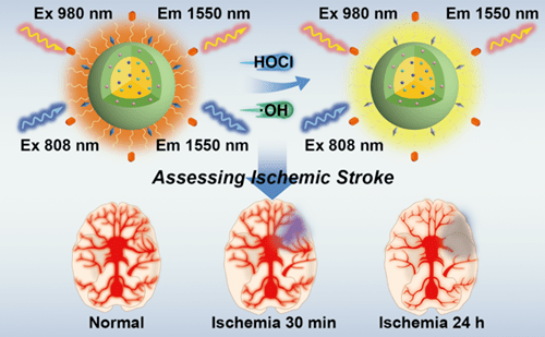缺血性脑卒中(Ischemic Stroke, IS)是导致长期残疾以及死亡的主要原因之一,该疾病的严重程度具有时间依赖性,及时评估IS对于该疾病的治疗以及预后起着至关重要的作用。利用比率型近红外二区纳米探针可有效富集在脑缺血病灶位点,可视化氧化应激水平用于及时评估IS。利用近红外二区成像的优势,该探针具有深层的脑组织穿透深度;基于目标物调控染料敏化RENPs发光的原理,该探针对高活性氧物种呈现优异的响应性能。综合以上功能,该探针通过可视化探针在病灶位点的富集程度以及氧化应激水平,在IS发生30min时即可对其进行监测,并评估其严重程度(传统磁共振成像则在IS发生24h才可观察到显著的信号变化)。