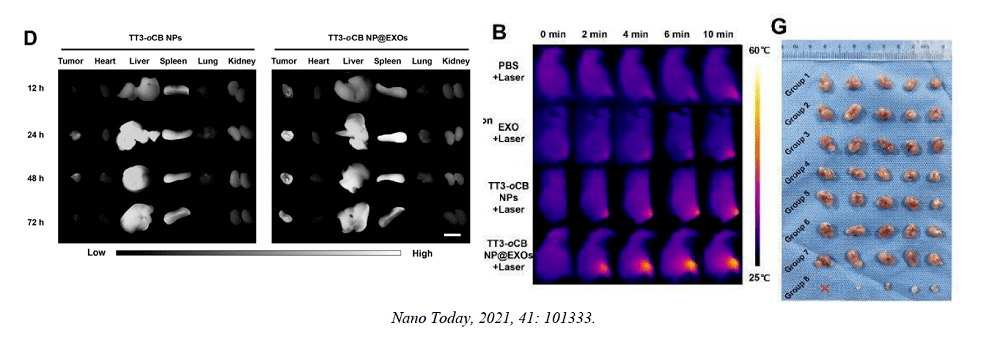 纳米粒子(NPs)辅助光热疗法(PTT)是一种有前途的癌症治疗方式,并且已经吸引了科学主流的注意。利用聚集诱导发射(AIE)纳米颗粒和肿瘤细胞来源的“外泌体帽”(TT3-oCB NP@EXOs)制备具有增强的第二近红外(NIR-II,900–1700nm)荧光特性和PTT功能。由于它们在808 nm照射下具有高且稳定的光热转换能力,因此TT3-oCB NP@EXOs可以用作仿生的NPs用于NIR-II荧光成像引导的肿瘤PTT,因此,随着其他靶向性差的AIE纳米粒子的验证,肿瘤细胞衍生的EXO/AIE纳米粒子杂化纳米囊泡可能为改善肿瘤诊断和PTT提供一种替代的人工靶向策略。