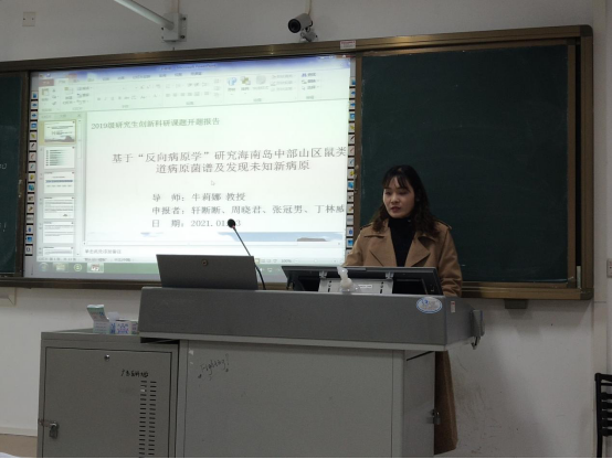 2021年1月13日上午,本院首届研究生创新科研项目开题汇报会在研究生楼702和703教室举行,生物信息学院李孔宁教授、科学实验中心张海英教授、基础医学与生命科学学院牛莉娜、林蓉和崔秀吉、肖乐教授为本次开题汇报会的评委,朱明月副院长出席本次汇报会。