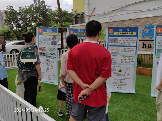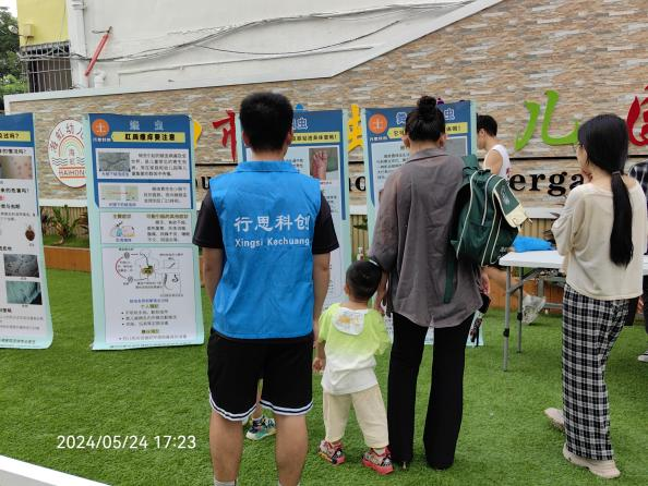 活动中,在范志刚老师指导和幼儿园老师的协助下,将蛲虫病原学诊断技术科普宣传单发送给每一位家长,同时通过微信将科普宣传单发放在各个社区群进行科普宣传。5月24日下午,范志刚老师和行思科创小组组员在海虹幼儿园门口展示了包括蛲虫、钩虫、粪类圆线虫等5张人体寄生虫的科普海报讲解,进一步加强科普宣传。