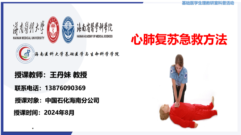 2024年8月,海南医科大学基础医学与生命科学学院生理学教研室主任董战玲的带领下再次扬帆起航,将“智防病痛,乐享健康”的科普理念带入了中国石化海南分公司马村油库,在该油库的培训中心成功举办了一场别开生面的心肺复苏急救知识科普活动。此次活动旨在提升企业员工在紧急情况下的自救互救能力,普及心肺复苏术(CPR)急救技能。