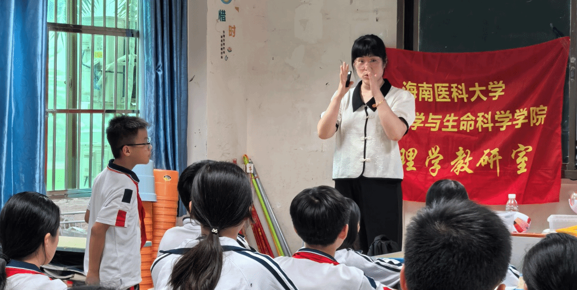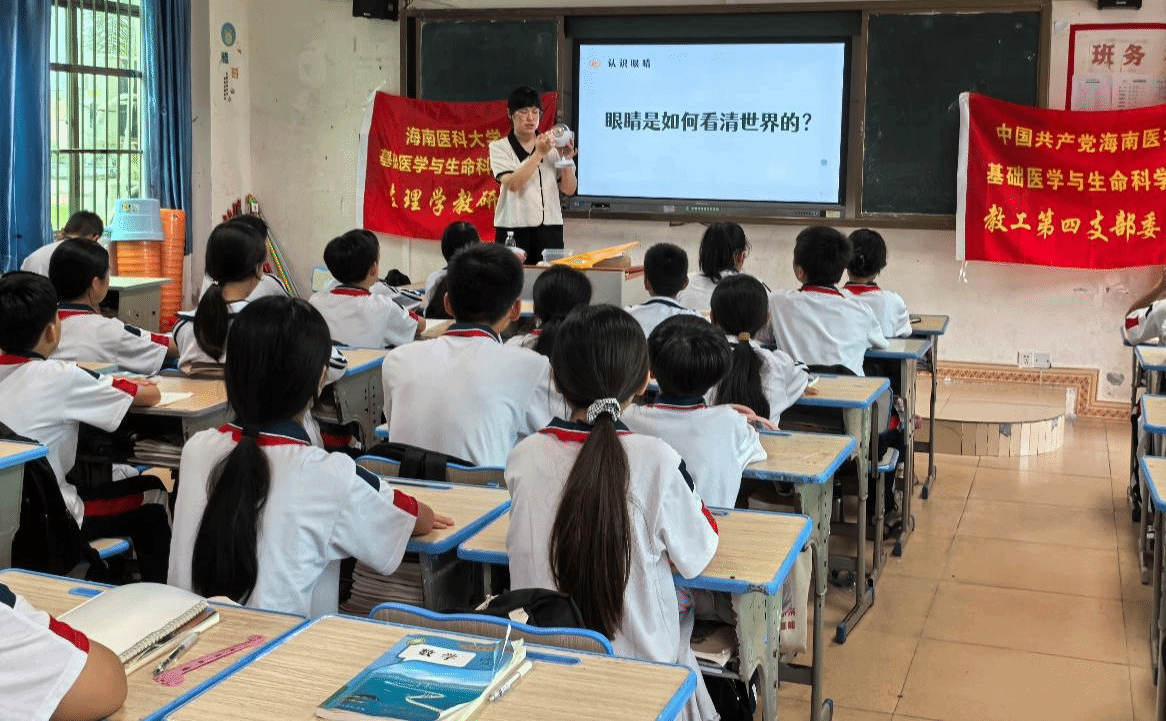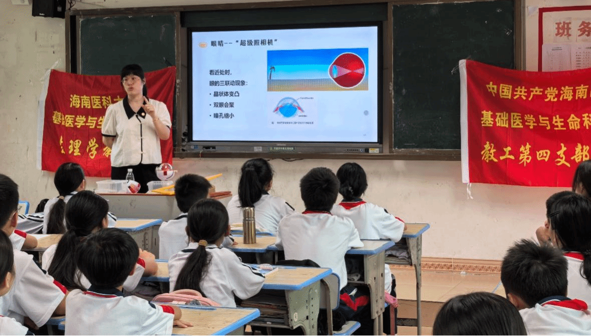 2024年9月20日上午,生理学教研室在李冬洋支部书记的组织与带领下,董战玲、翁启芳、张彩彩、陈国斌,一共五位老师前往屯昌红旗中学,为七年级的学生们带来了一场别开生面的科普宣传活动。张彩彩老师是本次科普活动的主讲教师,以其严谨的健康教育理念,深入浅出地向学生们讲解了眼球的结构和眼睛的生理功能,并分享应该如何预防近视的方法。