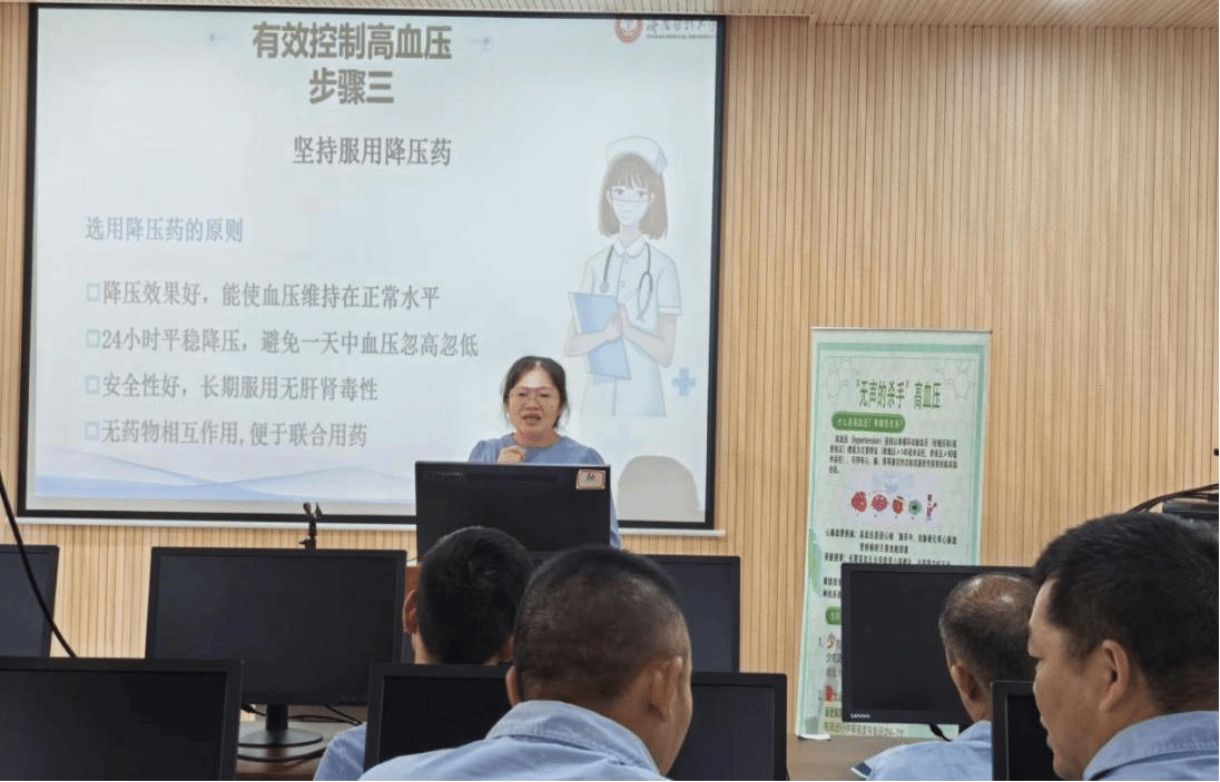 首先进行的是科普讲座环节。翁启芳老师作为主讲人,以其深厚的专业知识和丰富的临床经验,为油库的工作人员深入浅出地讲解了高血压的定义、成因、危害以及防治方法。她的话语既专业又接地气,让原本晦涩难懂的医学知识变得生动有趣,赢得了工作人员的阵阵掌声。
