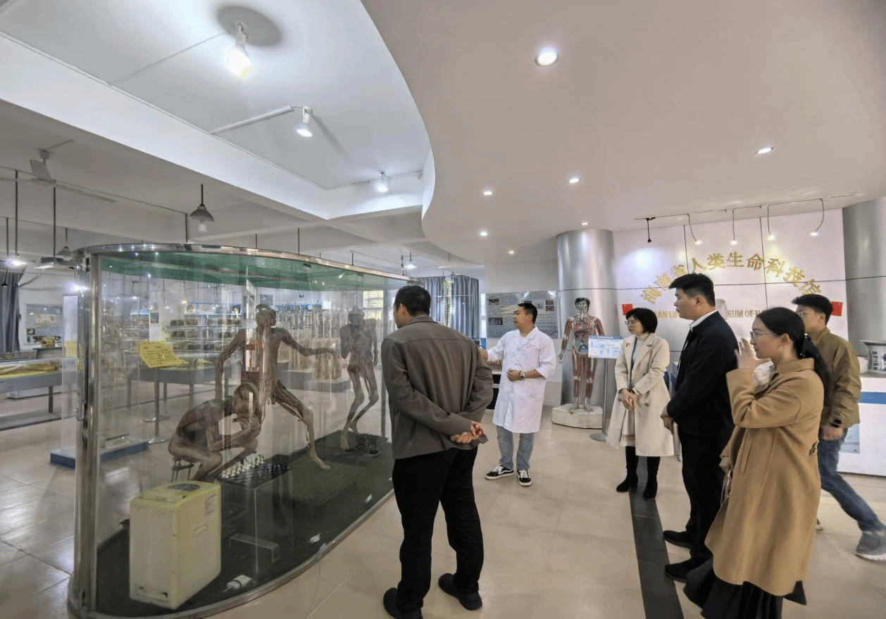 2025年3月18日,在我校团委书记郭向的带领下,海南省海口市龙华区团委书记柯淑骁等一行4人共赴海南医科大学海南省人类生命科技馆开展主题教育参观实践活动,通过沉浸式参观交流深化党组织干部对生命科学的认知。在负责科技馆相关工作老师的引导下,来访人员参观了人体器官系统标本展区、胚胎发育全程观察区、疾病防控病例展区及学生第二课堂标本制作区,通过观察人体结构,了解生命发育过程。