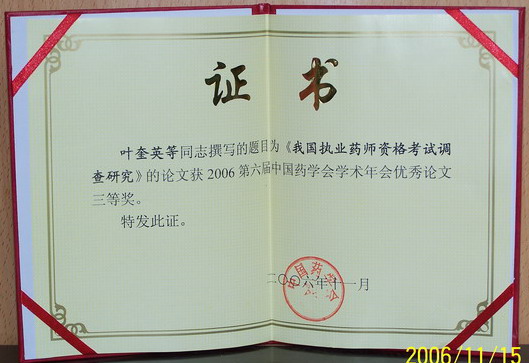 |     	药学系教师叶奎英撰写的题目为《我国执业药师资格考试调查研究》一文在中国药学会医院药学、军事药学、药事管理、药物流行病学分会场作报告并获中国药学会第六届学术年会优秀论文三等奖。同时参会的还有药学系教师陈峰。  	     	 	中国药学会学术年会已经成功举办六届,在我国药学领域产生了重大影响,同时得到了广大会员和医药科技工作者的广泛支持和参与。第六届学术年会于2006年11月9-11日在广州凤凰城大酒店召开,由中国药学会主办,广东省食品药品监督管理局承办,广东普乐康药业有限公司和广东省药学会协办。  	     	大会的主题是:医药自主创新和可持续发展。  	     	 	 中国药学会郑筱萸理事长致开幕词,国家食品药品监督管理局邵明立局长和中华医学会会长钟南山院士在会上讲话。此外中国工程院院士桑国卫、刘耕陶、中国科学 院院士陈凯先分别作了题为:“我国创新药物与中药现代化研究近况”、“五味子逆转肿瘤多药耐药性作用的新发现”、“基于基因功能的创新药物研究”的报告。 大会报告的还有:中国药品生物制品检定所常务副所长金少鸿、中国医学科学院医药生物技术研究所所长蒋建东、军事医学科学院毒物药物研究所所长刘克良、中国 医学科学院药用植物研究所教授杨峻山、北京大学药学院副院长张强、中国中医科学院中药研究所教授杜贵友、第二军医大学长海医院药剂科主任胡晋红、军事医学 科学院毒物药物研究所学术委员会主任恽榴红。会议到会一千余人,收到论文八百余篇。  	  	 |