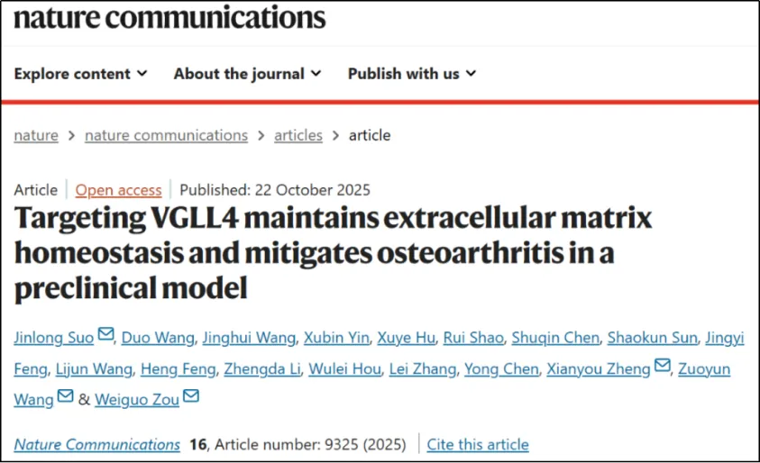 10月22日,海南医科大学(海南省医学科学院)邹卫国教授、复旦大学王作云教授、上海六院郑宪友教授和索金龙副研究员合作在《Nature Communications》在线发表了题为“Targeting VGLL4 maintains extracellular matrix homeostasis and mitigates osteoarthritis in a preclinical model”的研究论文。该研究首次揭示了VGLL4-TEAD-SMAD3三元复合物在维持软骨细胞外基质稳态的关键功能,其功能失调导致关节透明软骨纤维化,并通过AAV介导的基因回补策略验证了复合物的治疗潜力。