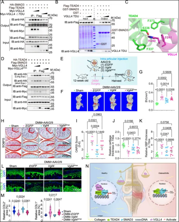 为了寻找关键的调控因子,研究者首先对骨骼干/祖细胞及人软骨细胞的单细胞测序数据进行了深度挖掘,发现Hippo信号通路中的转录辅因子VGLL4在软骨细胞中特异性高表达,而在损伤软骨及衰老软骨中,表达显著下降。这一现象提示VGLL4可能与软骨的稳态维持及病理进程密切相关。在功能验证中,研究者发现VGLL4在软骨中特异性高表达,而在损伤或衰老软骨中显著下降。通过构建软骨细胞特异性敲除VGLL4的小鼠模型,发现小鼠会自发出现早期骨关节炎表型,并在DMM手术诱导后表现出更严重的软骨破坏及纤维化。转录组分析显示VGLL4缺失引起一系列胶原合成与基质组装相关基因广泛下调。机制研究表明,VGLL4通过其C末端的TDU结构域与TEADs和SMAD3形成三元复合体。结构预测与突变实验证实,TEAD4与SMAD3通过氢键和疏水作用结合,而VGLL4通过π-π堆积与TEAD4稳定结合。破坏任一相互作用界面均导致复合体解体,并丧失促进基质基因表达的功能。为验证其转化价值,研究团队向骨关节炎模型小鼠关节内注射携带Smad3或Vgll4基因的AAV病毒。结果显示,回补野生型基因能有效缓解病情,而回补无法形成三元复合体的突变体则无效。这证明VGLL4-TEAD-SMAD3三元复合体的形成是实现软骨保护作用的必要条件。
