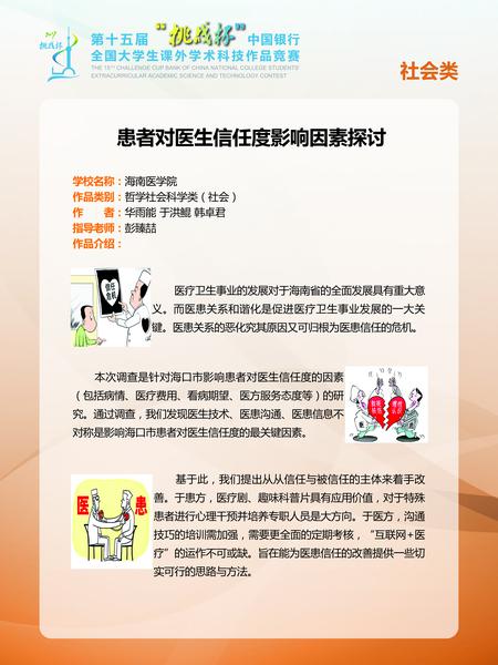 11月14日,林英姿副校长带领我校代表队参加了在上海大学举行的第十五届“挑战杯”全国大学生课外学术科技作品赛决赛。经过激烈角逐,我校获得二等、三等奖各一项。获得二等奖的作品是国际护理学院戈旭伟、李建菊、王晨、方帅华同学创作的《护理教学模型及临床器械的改良》,指导老师为该院教师韦玉敏,这项作品是海南省代表队在本次比赛中取得的最好成绩;获得三等奖的作品为《患者对医生信任度影响因素探讨》,该项作品由热带医学与检验医学院的华雨能、于洪鲲、韩卓君同学创作,指导老师为彭臻喆。海南省代表队在本次竞赛中共获得二等奖1项、三等奖10项,我校取得全省最好成绩。