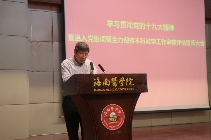 在誓师大会上,杨俊院长指出,评估是机遇,更是挑战。此次审核评估事关我校更名,事关我校长远发展,希望大家再接再厉,最实的风貌、最佳的状态、最佳的形式、最佳的方案冲刺最后一公里。他提出了四点要求:一是要振奋精神,以最佳风貌面对专家。全体师生员工要振奋精神,上足劲、绷紧弦,不畏艰难,勇往直前;切实做到目标同向、工作同步,形成强大迎评工作合力。要爱校如家,一切从学校大局出发,不利于学校的话不说,不利于学校的事不做,充分向评估专家展示我们海医教师、海医学子的最佳教风和学风。二是要勇于担当,以最佳状态做实工作。各二级学院党政负责人和各职能部门负责人是本单位评估工作的第一责任人,要涉深水、站前台,亲自动员,亲自督办,统筹协调。既要分工明确、各司其职,又要密切配合、相互支持,确保以最佳状态完成各项工作。三是要做精做细,以最佳形式展示成绩。各部门、单位都要继续深入的宣传,营造良好的迎评氛围,使审核评估入脑入心。赶紧行动起来,搞好校园环境卫生,营造一个整洁、规范、有序、美丽的校园环境。四是要精心细致,以最佳方案做好接待。要按照热情、顺畅、方便、融洽、诚恳和不违规的要求,细化接待方案,给专家提供热情周到的服务,让专家工作顺利、心情愉快。