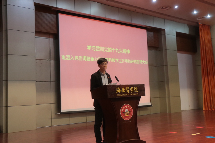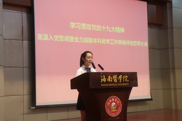 在誓师大会上,党委副书记谢江波首先带领在场的全体师生员工党员面对党旗重温了入党誓词;杨俊院长对审核评估迎评工作做了再部署、再动员;第二临床学院党委书记何琪懿、基础医学与生命科学学院何佟、15级学生张纯分别作为相关院系领导代表、老师代表、学生代表相继作了热情洋溢、鼓舞人心的表态发言,纷纷表示将保持高昂的精神,全然投入到本科教学工作审核评估的相关工作中。