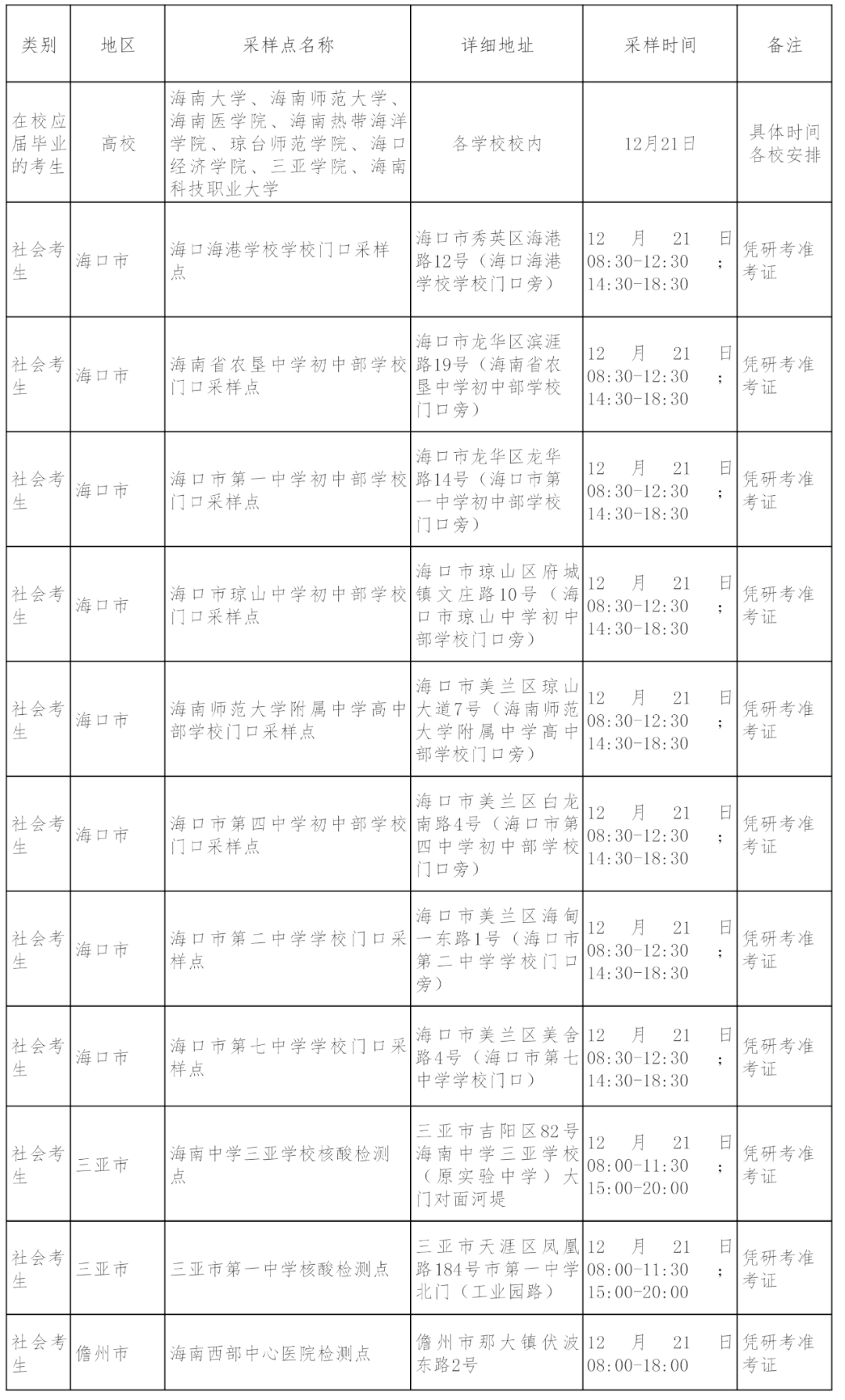海南省2023年研考增设考生核酸采样点列表