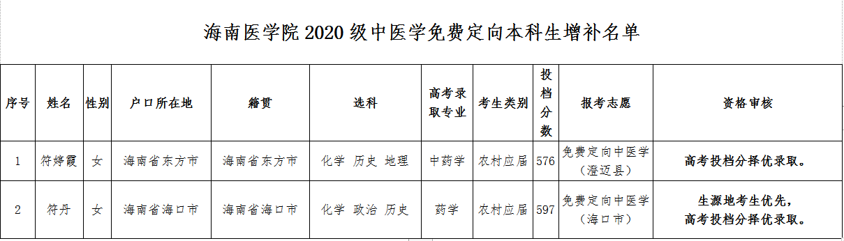 2020级中医学订单定向免费生缺额2名,其中定岗服务市县为海口市缺额1名,定岗服务市县为澄迈县缺额1名。招生办公室按照有关文件精神在2020级海南籍农村生源中进行增补,共21名新生报名,符合条件新生17名(海口市12名、澄迈县5名)。